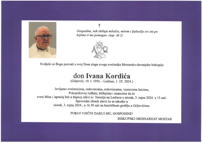 U nedjelju, 1. rujna 2024., u jutarnjim satima u župnoj kući na Ledincu iznenada je preminuo don Ivan Kordić, svećenik Mostarsko-duvanjske biskupije i župnik župe svete Male Terezije na Ledincu.